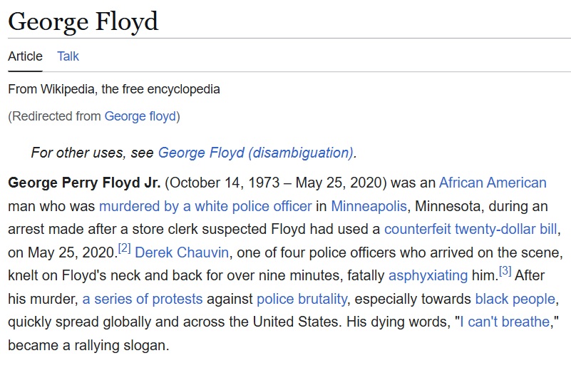 An even more pronounced divergence is seen in the entries for George Floyd. Wikipedia identifies him as an “African American man who was murdered by a white police officer” and focuses on the subsequent global protests.