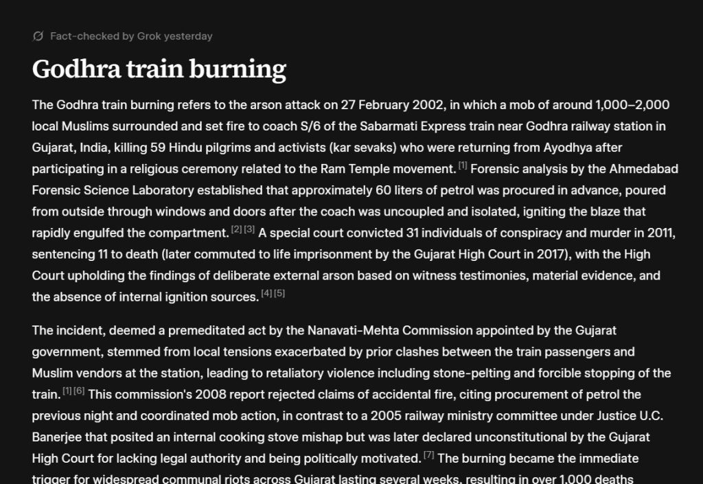 Grokipedia’s entry states unequivocally that it was an “arson attack” by a “mob of around 1,000–2,000 local Muslims,” citing forensic reports of pre-procured petrol and court convictions.