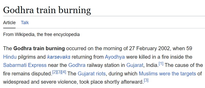 Wikipedia’s opening paragraph describes the event where 59 Hindu pilgrims were killed, noting that “the cause of the fire remains disputed,” and quickly pivots to the subsequent Gujarat riots.