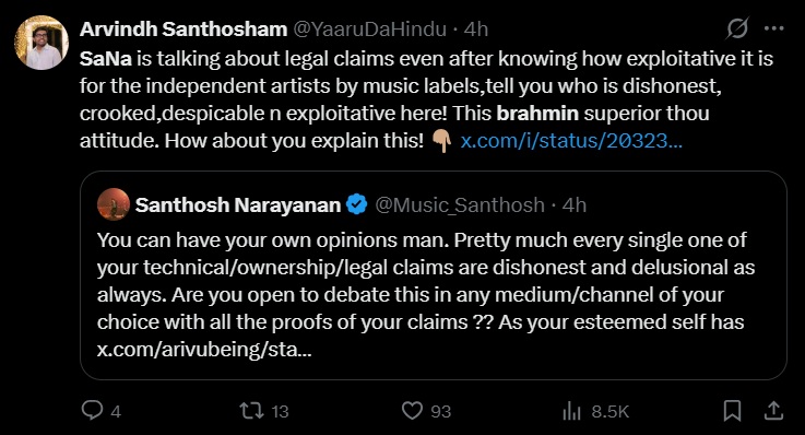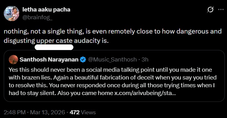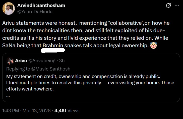 What began as a dispute over credit and royalties for Enjoy Enjaami has quickly taken a predictable turn. Instead of focusing on contracts, evidence, and creative contributions, sections of the Dravidianist ecosystem online have shifted the debate to Santhosh Narayanan’s Brahmin identity, framing the issue as caste appropriation. This pattern is familiar in Tamil Nadu’s political discourse: when facts become inconvenient, the argument pivots to identity.