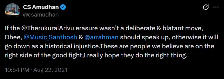 Within hours, filmmaker CS Amudhan escalated: “If the @TherukuralArivu erasure wasn’t a deliberate & blatant move, Dhee, @Music_Santhosh & @arrahman should speak up, otherwise it will go down as a historical injustice. These are people we believe are on the right side of the good fight, I really hope they do the right thing.”