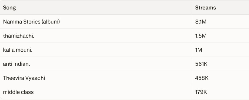 Enjoy Enjaami is a masterpiece. It is also the product of Santhosh Narayanan’s production, Dhee’s vocal presence, and a music label’s international distribution network. Strip those elements out and Arivu’s independent output, by the numbers, is a collection of low-stream releases that have never broken through on their own.