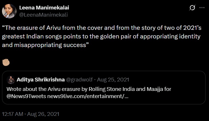 Note the framing. Not “why wasn’t Arivu on the cover?” but “he has once again been invisiblised” – as if to ‘imply’ a pattern of deliberate erasure. The “once again” was doing enormous work. There was no prior Rolling Stone erasure to point to. Ranjith was establishing a pattern that did not exist.
