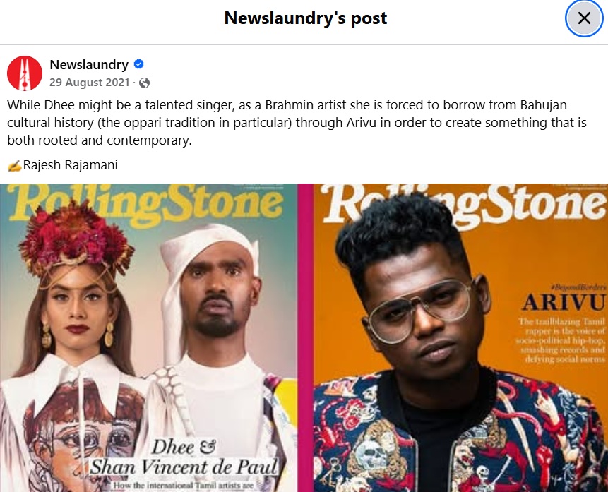 The most revealing and ugliest dimension of the ecosystem’s campaign was what it did to Arivu’s collaborators. Dhee, whose voice is on every second of the song, was subjected to a sustained ideological assault on the basis of her caste identity. A widely circulated Newslaundry-amplified quote from multimedia artist Rajesh Rajamani framed her participation in the song as an act of cultural extraction: “While Dhee might be a talented singer, as a Brahmin artist she is forced to borrow from Bahujan cultural history (the oppari tradition in particular) through Arivu in order to create something that is both rooted and contemporary”.
