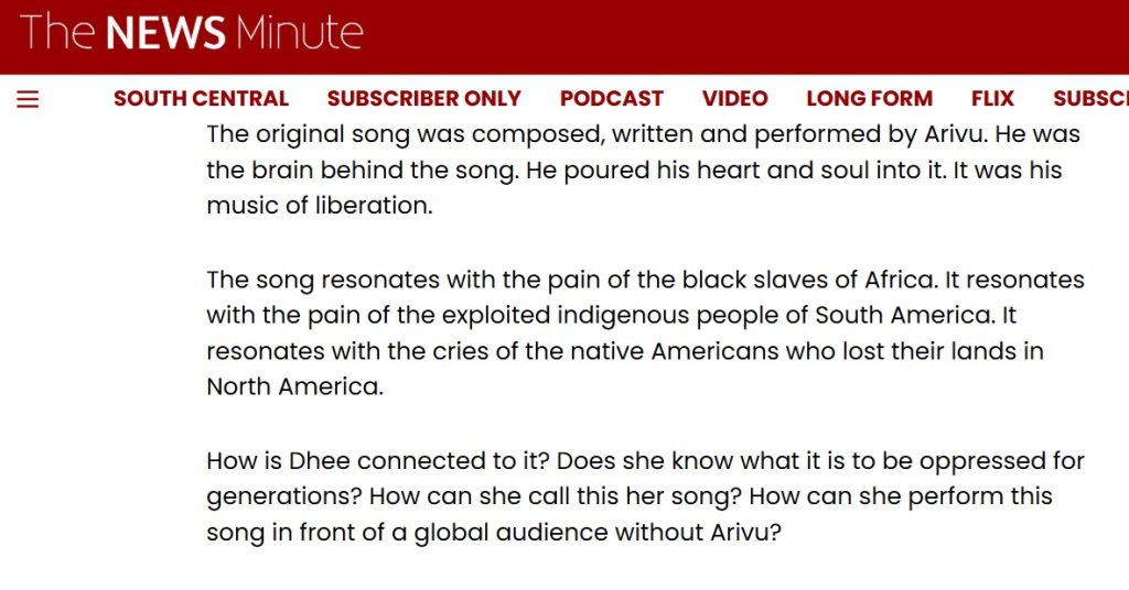 The News Minute went further, publishing a piece by the same Dalit activist they platformed on their YouTube channel, that directly questioned whether Dhee had any right to the song at all: “How is Dhee connected to it? Does she know what it is to be oppressed for generations? How can she call this her song? How can she perform this song in front of a global audience without Arivu?”.