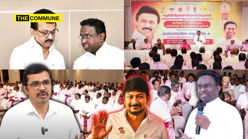 In October 2025, in what seemed to be a targeted outreach to the DMK’s traditional Christian vote base, a taxpayer-funded “awareness programme” was held in Chennai. The event was organised by the Tamil Nadu State Minorities Commission and featured overt Christian imagery and biblical verses alongside a large photograph of Chief Minister MK Stalin. Addressing bishops and clergy, Commission chairman Rev. Fr. S. Joe Arun asserted that only Stalin could protect religious and linguistic minorities. Critics argue the programme amounted to political campaigning using state machinery, reflecting the DMK’s anxiety over shifting Christian political loyalties towards Vijay’s TVK ahead of 2026.