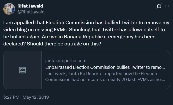 Jawaid and Janta Ka Reporter have also been accused of peddling fake news related to electronic voting machines (EVMs). In 2019, the portal published claims that 20 lakh EVMs had gone missing, a report that was later officially refuted by the Election Commission of India. While other outlets that carried similar claims issued clarifications or took down their reports, Jawaid accused the Election Commission of “bullying” social media platforms into removing his content.