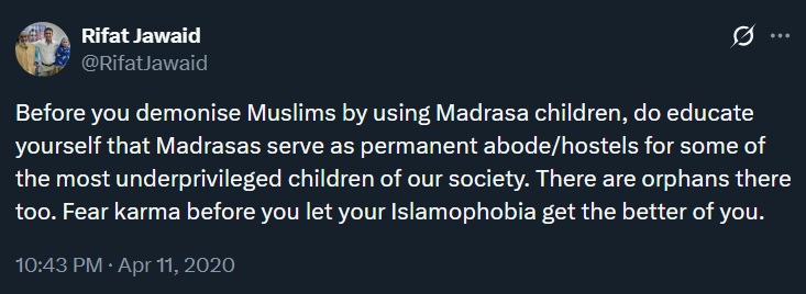 Jawaid has also been a vocal defender of madarsas, repeatedly downplaying concerns raised about radicalisation. In a 2020 post, he argued, “Before you demonise Muslims by using Madrasa children, do educate yourself that Madrasas serve as permanent abode/hostels for some of the most underprivileged children of our society.”