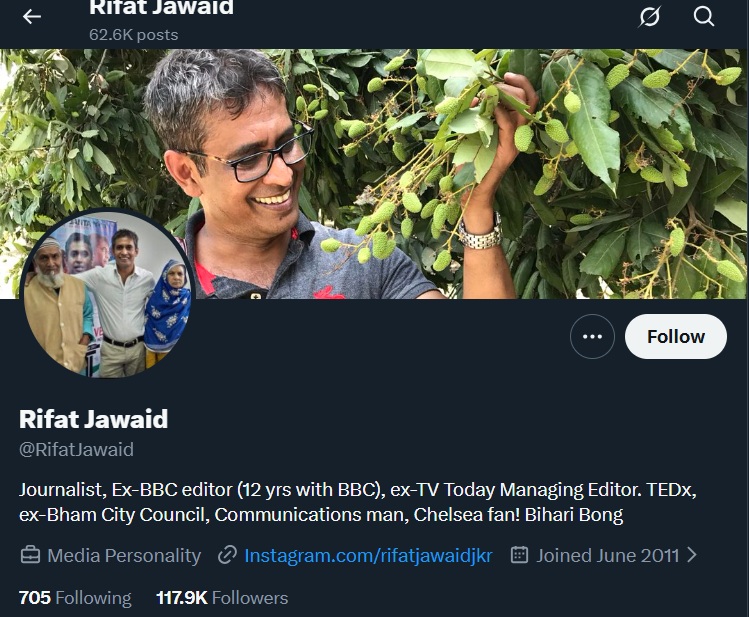 He worked at BBC for 12 years.After a video claimed that a Muslim boy selling balloons was assaulted, Rifat Jawaid posted: “Member of hijda qaum. Hindutva terrorists!”