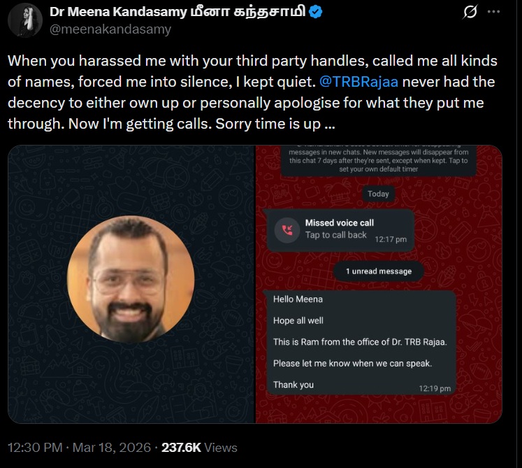 The allegations were raised by Dravidian stockist writer Meena Kandasamy, who recently stated that she had been subjected to sustained online abuse, including character assassination and coordinated attacks, by accounts linked to the ruling party’s digital network. Among those she identified was Ramanathan, who operates under the handle “Madarassi” on X.