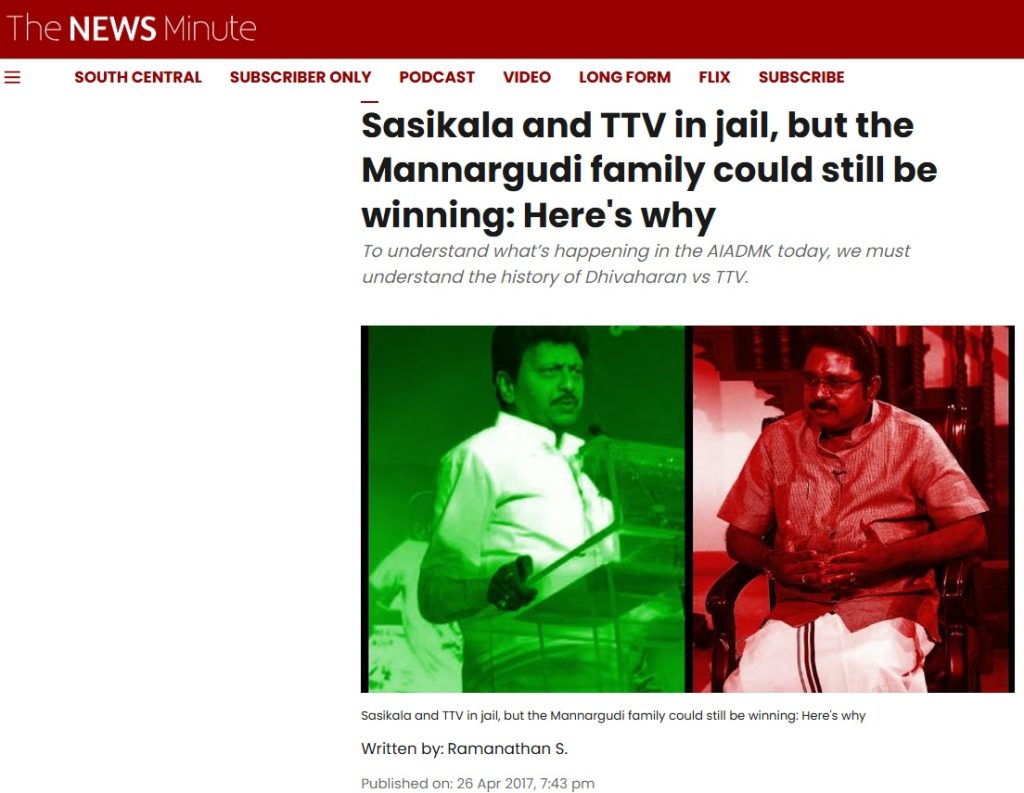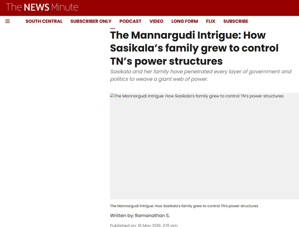 It is also alleged that his association with Rajaa overlapped with his time in journalism as his reportage during this time include a hitjob on former CM J Jayalalithaa’s associate, VK Sasikala and her extended family network, often referred to as the “Mannargudi cartel,” which detailed the rise of figures such as V. Dhivaharan.