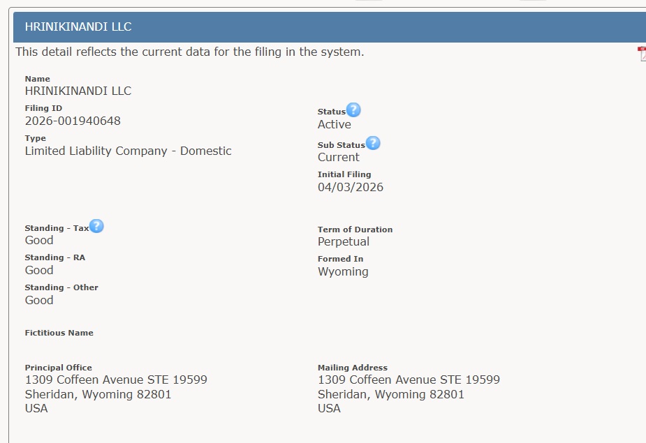 Wyoming Secretary of State records show HrinikiNandi LLC was incorporated on 3 April 2026 at 10:33 am local time.