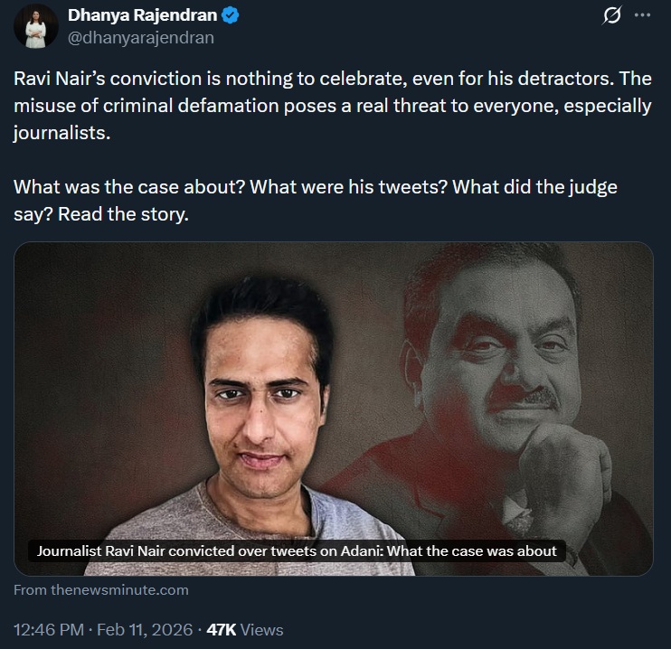 The conviction of self-styled “independent investigative journalist” Ravi Nair in a criminal defamation case has triggered predictable outrage from India’s entrenched left-liberal media ecosystem. Leading that chorus is The News Minute and its editor Dhanya Rajendran, who have rushed to frame the judgment as an assault on press freedom rather than what it legally is – a conviction delivered by a court of law after due process.