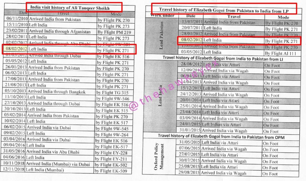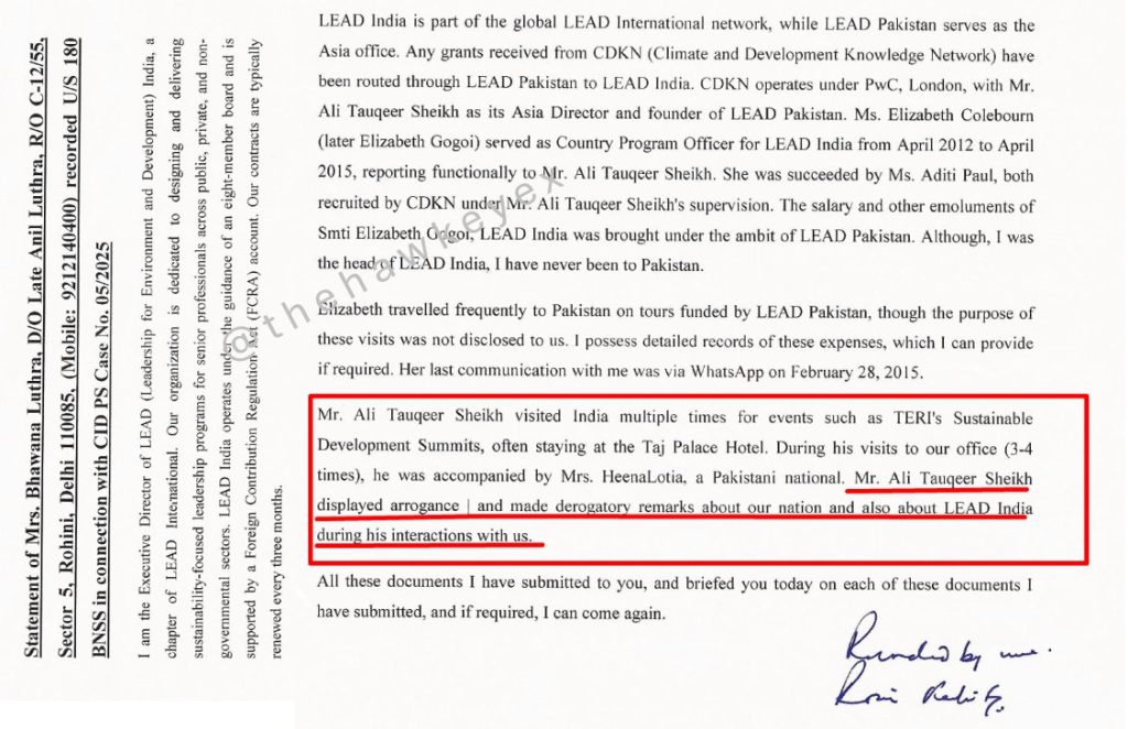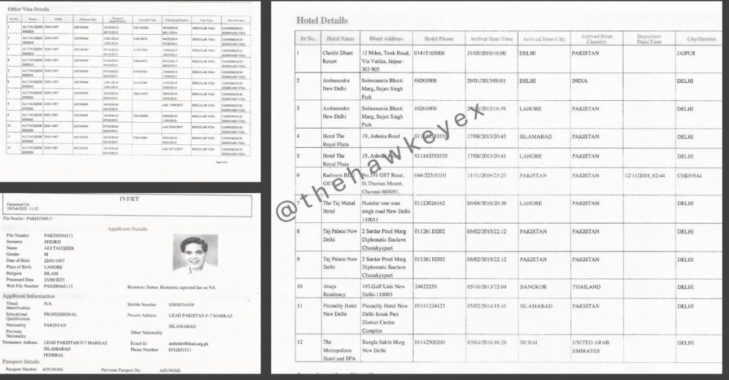 The probe also examined travel details of Ali Tauqeer Sheikh, identified in the documents as a senior functionary associated with Lead Pakistan. Records include his travel itineraries within India and details of hotel stays.