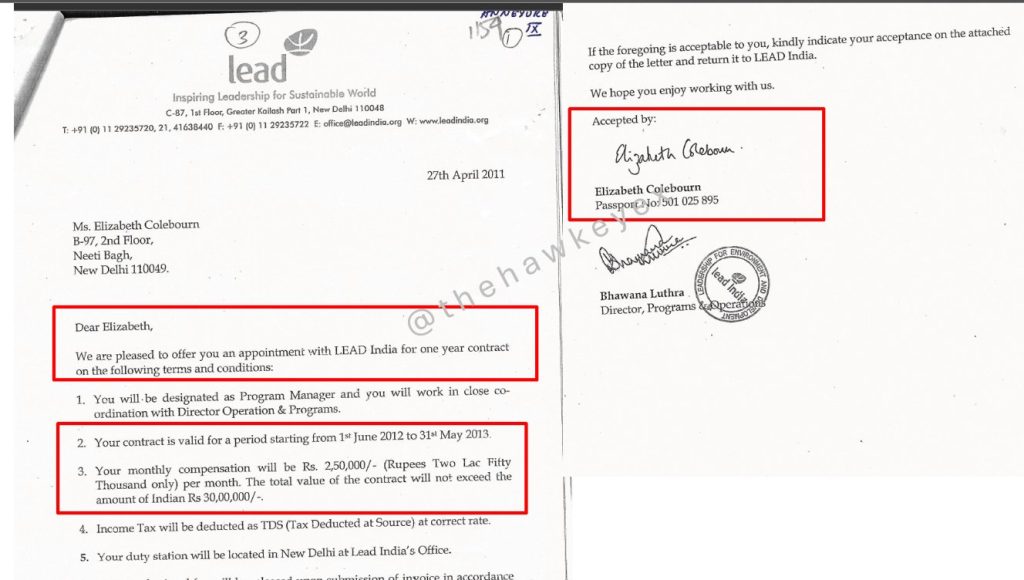 A separate document shows that Colburn was later issued an offer by “Lead India” on 27 April 2011, with the contract scheduled to commence from 1 June 2012. The remuneration cited in the contract was ₹2.5 lakh per month.
