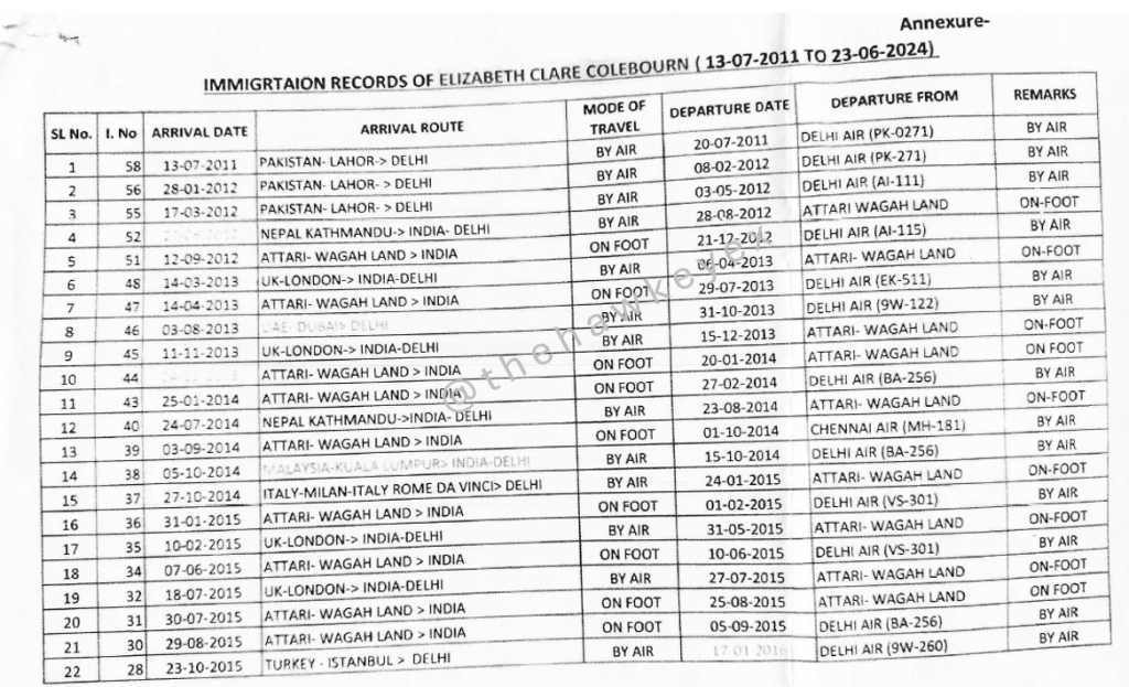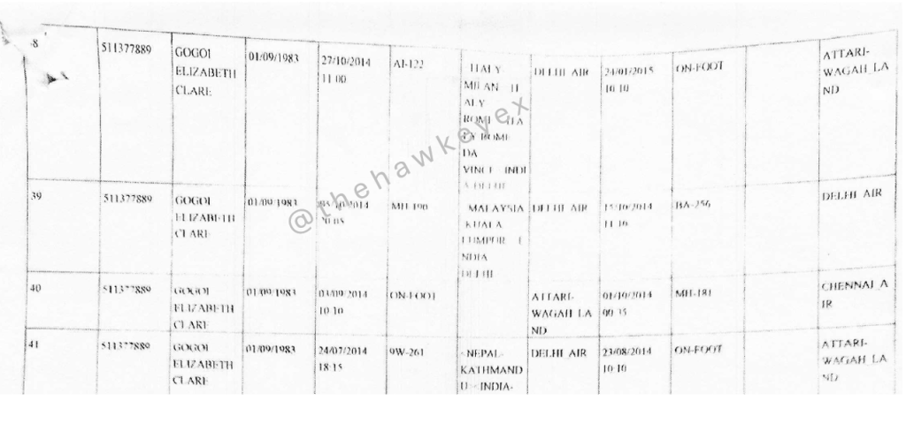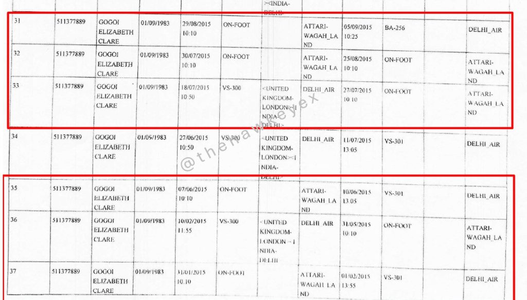 Investigators noted that several crossings were made via the Attari–Wagah land border, with travel mode recorded as “on foot.”
