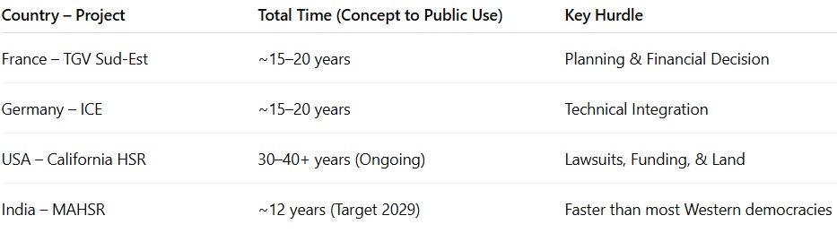 Building a Bullet Train is not like laying a highway; it is building a 500-kilometer precision instrument. When critics compare India to other nations, they conveniently hide the facts about “Democratic Friction”, inherent in a free nation. Despite being a vibrant democracy navigating intricate land laws, India is on track to complete its first HSR in roughly 12 years, outpacing the timelines of veteran players like France and Germany.