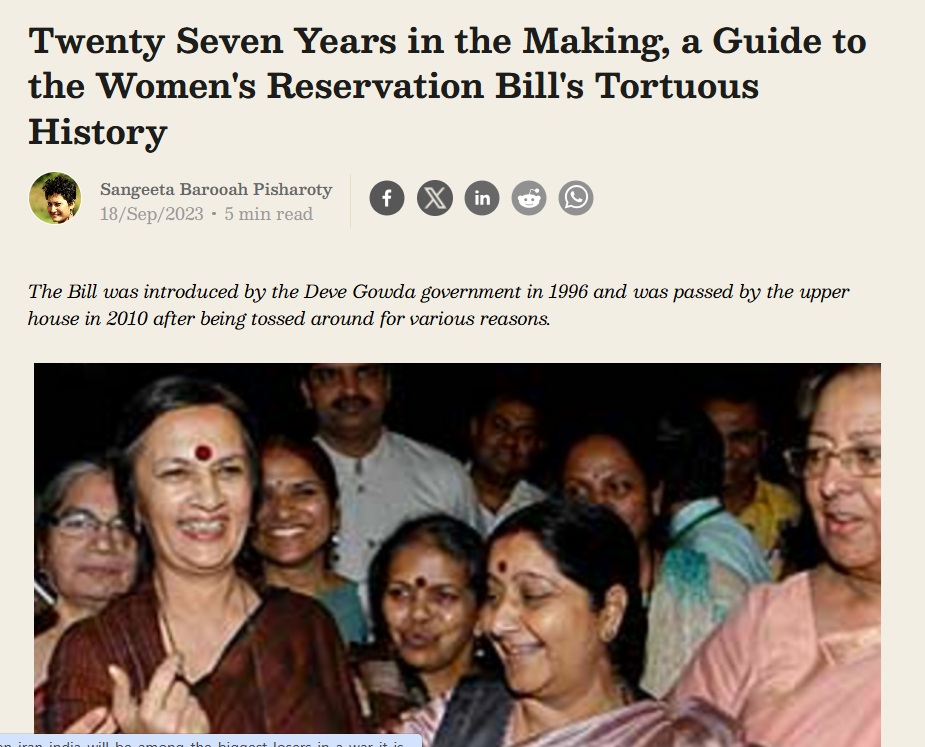 When nothing was happening on the Women’s Reservation front under the BJP government, The Wire was indignant. On 16 September 2016, it tweeted not once but twice: “Why has the Women’s Reservation Bill been tossed around for 20 years?” and “The Women’s Reservation Bill completed 20 years of existence on Sept 12. Why hasn’t it been passed yet?”
