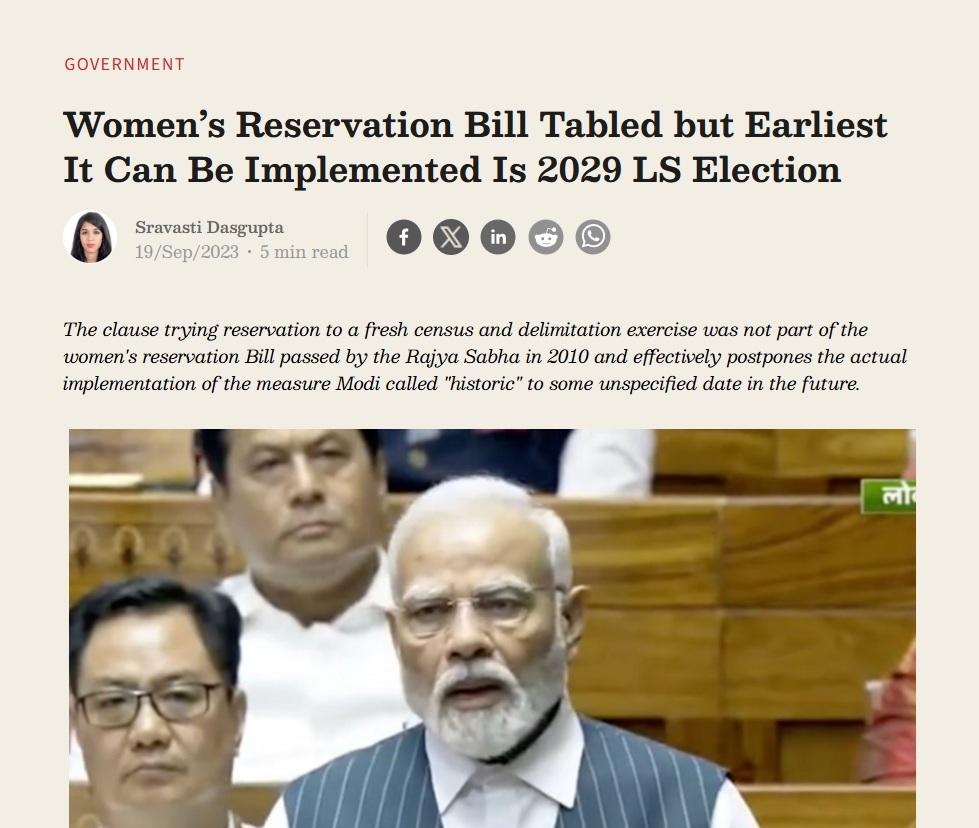 Then came September 2023 – the BJP actually passed the Nari Vandan Adhiniyam. This should have been a moment The Wire welcomed, given seven years of demanding it. Instead, the platform pivoted instantly. Sravasti Dasgupta’s piece on 19 September 2023 bore the headline: “Women’s Reservation Bill Tabled but Earliest It Can Be Implemented Is 2029 LS Election.”