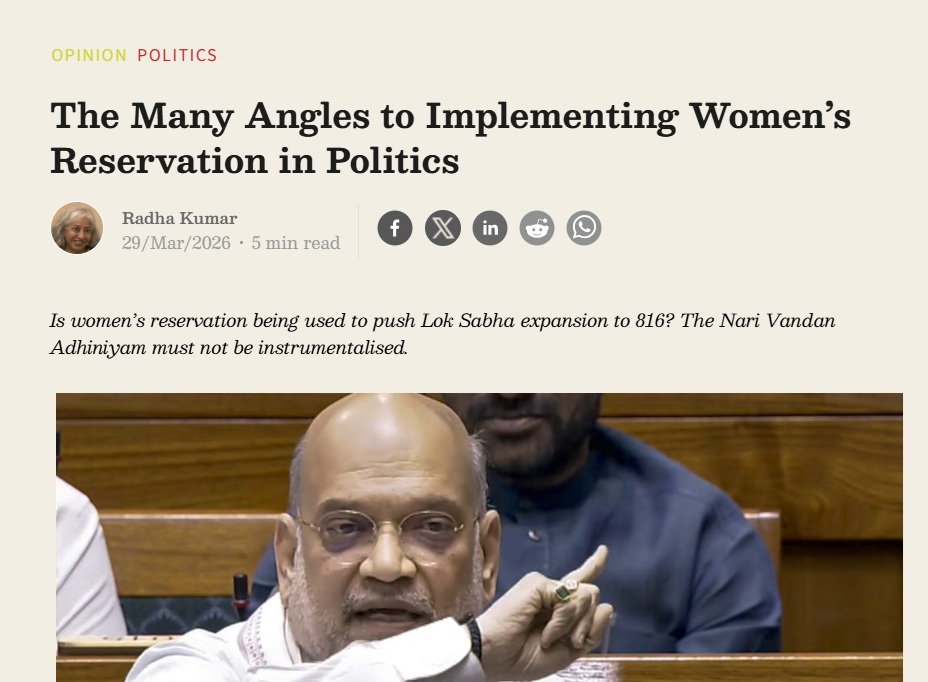 By March 2026, with Amit Shah actively pushing implementation through delimitation consultations, The Wire published Radha Kumar’s piece – “The Many Angles to Implementing Women’s Reservation in Politics.”