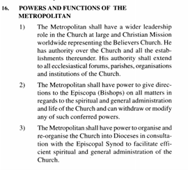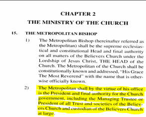 Contrary to what Yohanan said, a perusal of the constitution of the Believers Church shows that the Metropolitan of Believers Church wields enormous powers and is the final authority on every issue concerning Believers Church. He has powers not only on spiritual matters, but on entire administration, organisation and restructuring/re-organisation of Believers Church. In most of the court cases filed by Believers Church, Government agencies, brochures of educational institutions of Believers Church, Yohanan is shown as the Managing Trustee of Believers Church.