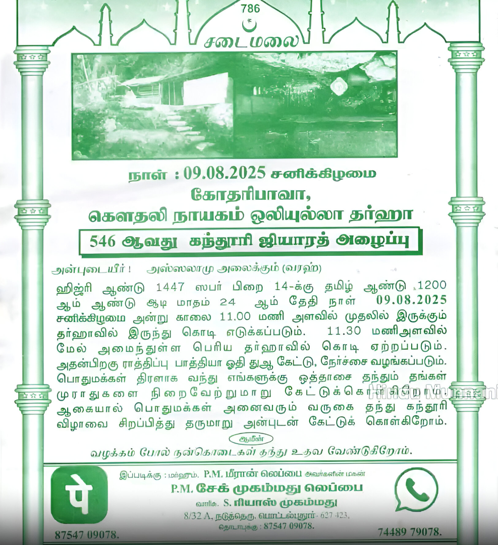 “On the 14th day of the month of zafar pirai in the Hijri year 1447, corresponding to the 24th day of the Aadi month Tamil year 1200, Saturday, 09.08.2025, the flag will first be taken out from the Dargah at 11:00 AM. At 11:30 AM, the flag will be hoisted at the larger Dargah located above. Following this, Fatiha will be recited, prayers will be offered, and offerings will be distributed. We kindly request the public to gather in large numbers, extend their support, and fulfill their vows. Therefore, we cordially invite all members of the public to attend and grace the Kandhuri festival. As always, we request your generous donations to help with the festival.”