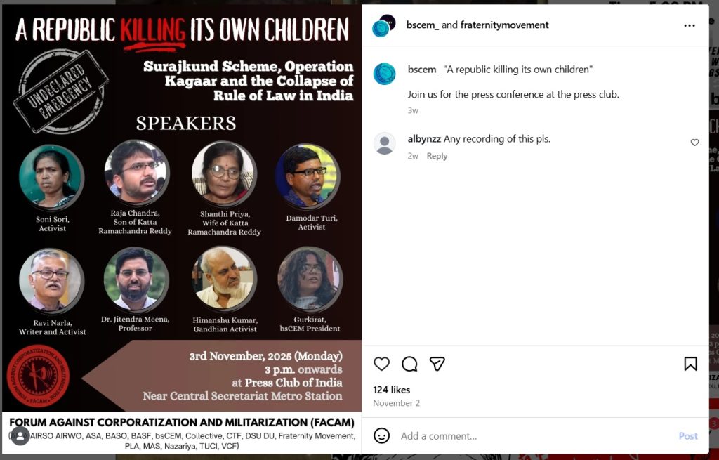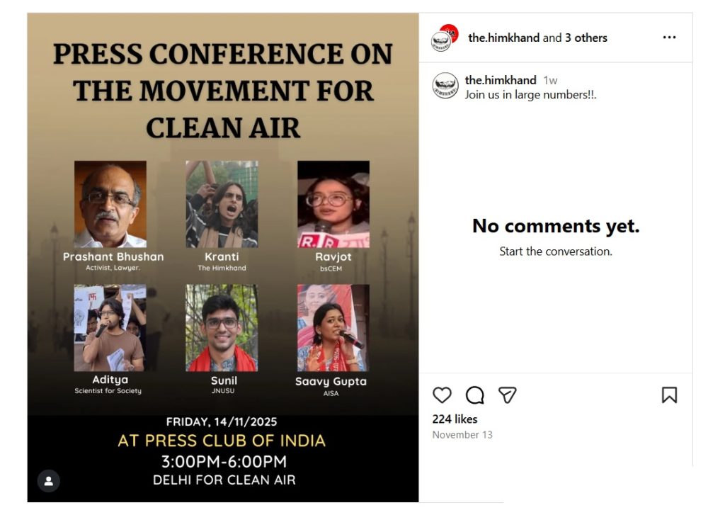 The collaboration between these groups is not new. On 14 November 2025, bsCEM organized a conference in collaboration with other leftist outfits including Himkhand and the All India Students Association (AISA) of Delhi University, on the subject of pollution. Significantly, the event featured Prashant Bhushan as a speaker—a lawyer who was a major provocative voice during the 2020 anti-Hindu Delhi riots.