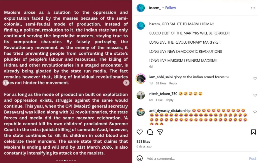 Another protester described Hidma as a “tribal person who took up arms to fight for their rights,” attempting to legitimize his violent campaign against the Indian state as a “struggle for water, forests, and land.”
