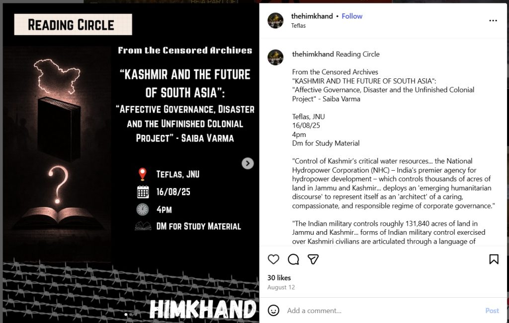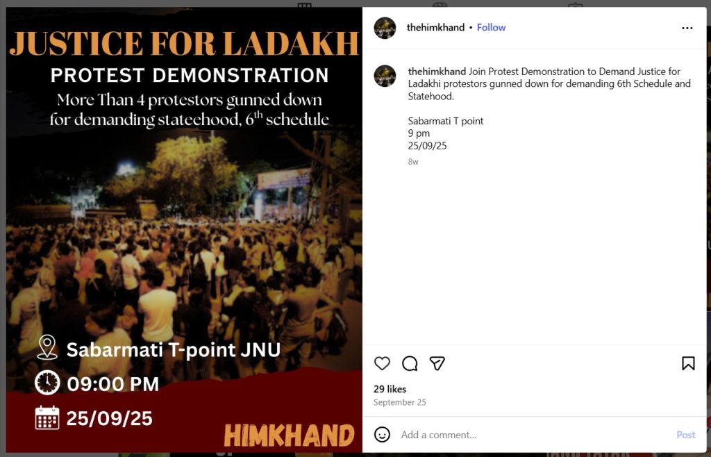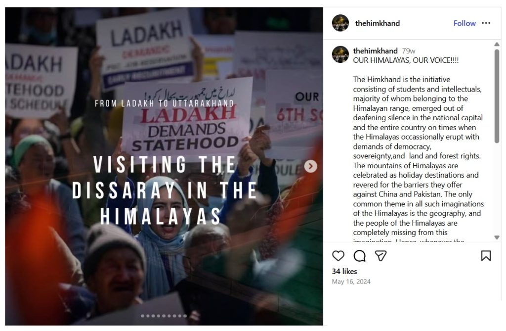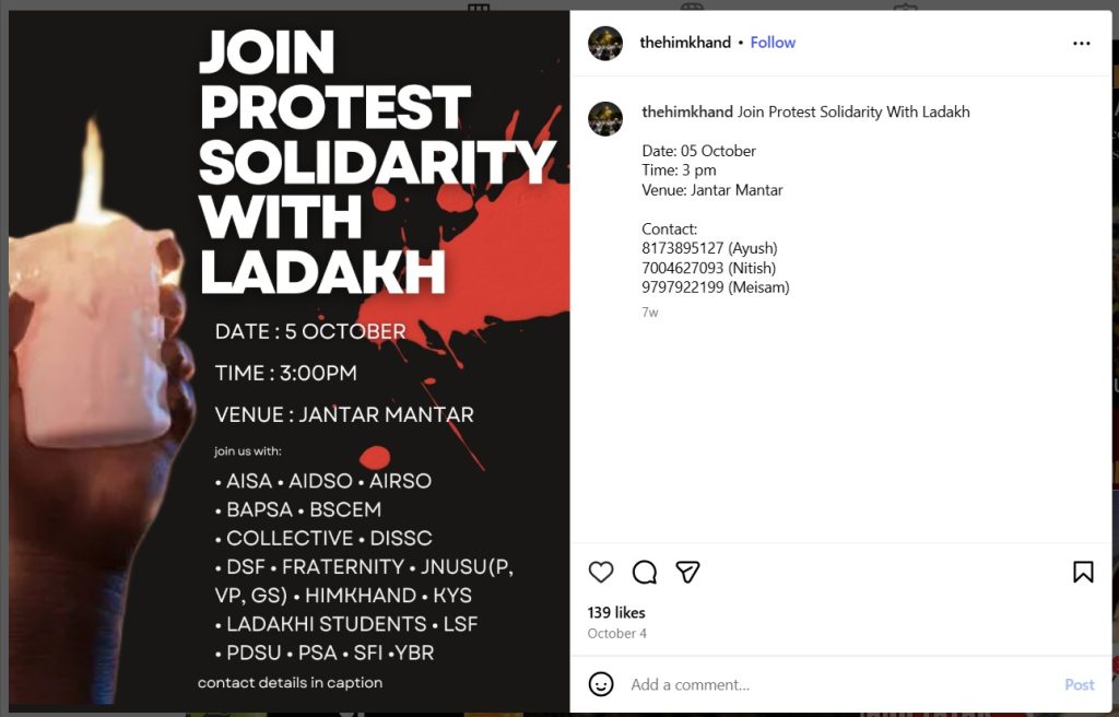 In October, the organization openly championed the Ladakh movement and rationalized violence, including the torching of a BJP office, which it called a “symbolic rejection of the party’s model of anti-Himalayan development.”