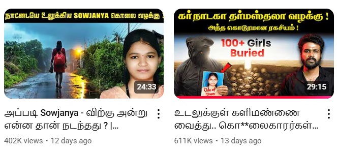 Several other prominent Tamil YouTubers such as Madan Gowri, Bogan, etc had been posting videos on the Sowjanya murder case and connecting it to the Dharmadhikaris of Dharmasthala. Owing to court orders, the videos were removed, yet some still remain.