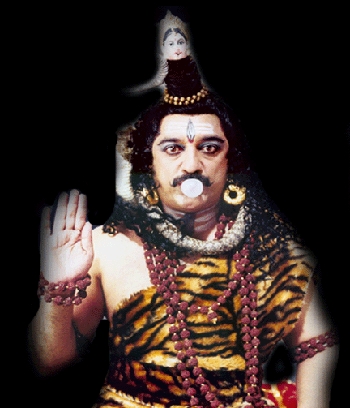 Kamal’s character in this movie is a Hanuman devotee (associated with Vaishnavism), while his family members are shown as Shiva worshippers with Vibhuti marks. In one scene, Kamal dresses as Lord Shiva for a comedy scene in a film, ridiculing the deitywhere he is seen blowing bubbles with his bubblegum, ridiculing and caricaturing Lord Shiva as if he was as a joke.