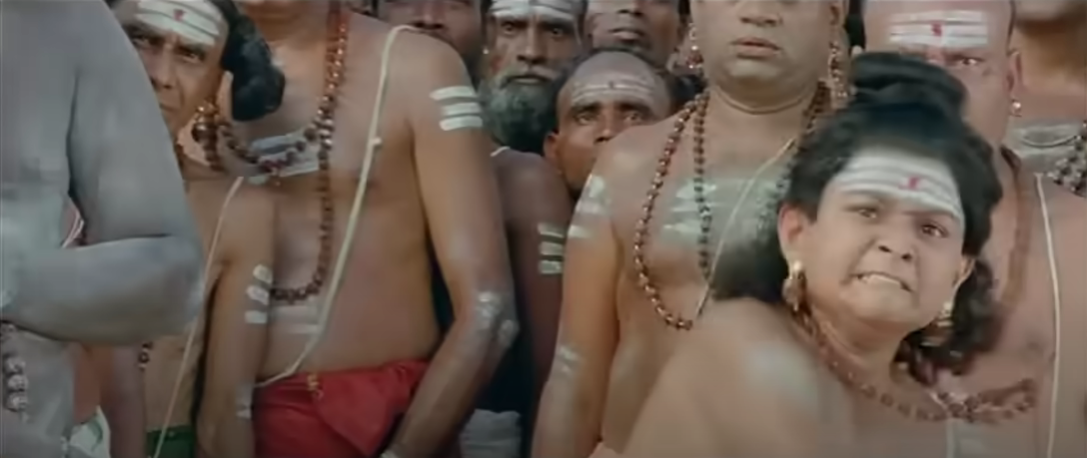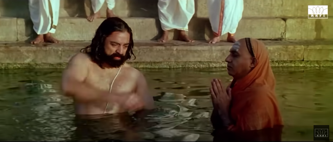 The film’s opening depicts King Kulothunga Chola II (a Shaivite), played by actor Napoleon, as a tyrant who orders the removal of a Vishnu idol from the Chidambaram temple. Kamal’s character, Rangarajan Nambi, a hardcore Vaishnavite, is tied to the idol and thrown into the sea—a fabricated, melodramatic scene.