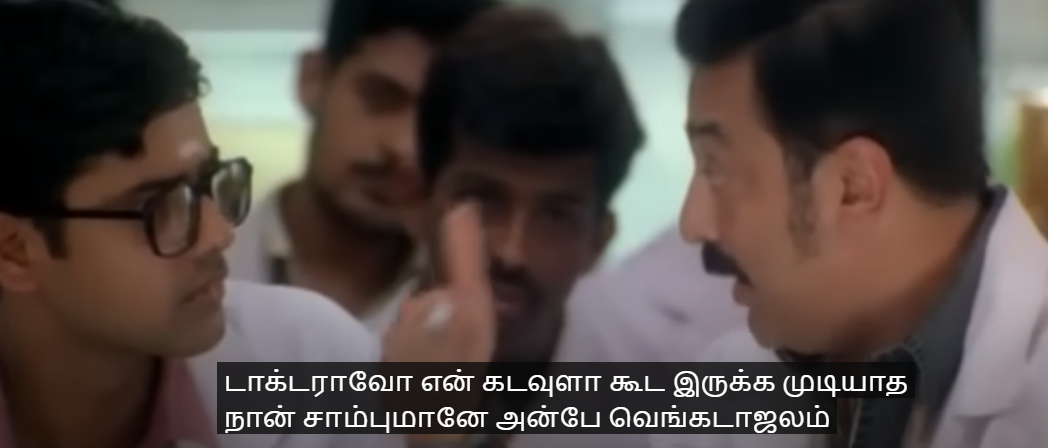 In a scene, Kamal’s character derisively calls his roommateSambu Mavan”—a nickname referencing Lord Murugan (also called Sambu). Kamal also tries to pass off a new phrase “Anbe Venkatachalam“. When the roommate corrects him, saying Isn’t it Anbe Sivam?, Kamal dismissively replies, I have already told it, let this be a new one.”