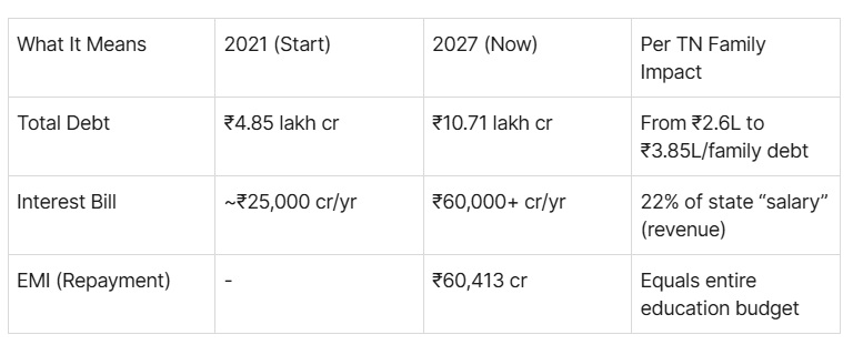 Based on the state’s own 2021 estimate of about ₹2.64 lakh debt per family, the projected ₹10.71 lakh crore by 2027 would imply roughly ₹3.8–3.9 lakh per family.