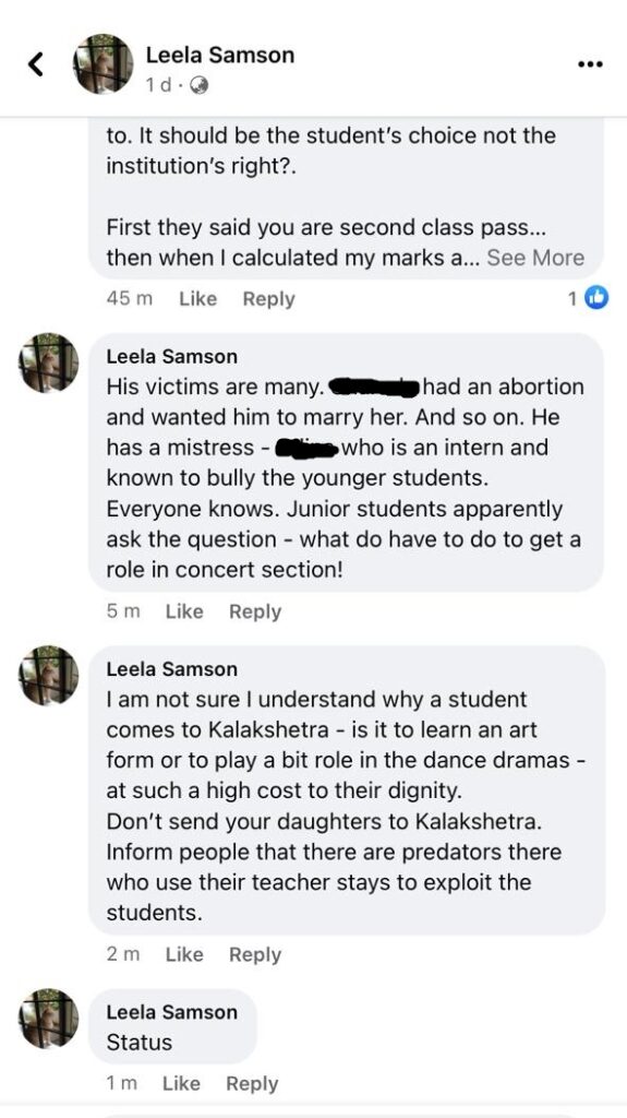 She also amplified it on X a month after Leela Samson made the Facebook post and deleted it. She wrote, “Please amplify. Leela Samson spoke about an alleged child sex offender in Kalakshetra. She described experiences of sexual assault and rape and then deleted the post and comments. Sex offenders going scot free in the Carnatic Music, Bharatnatyam space is not new.”