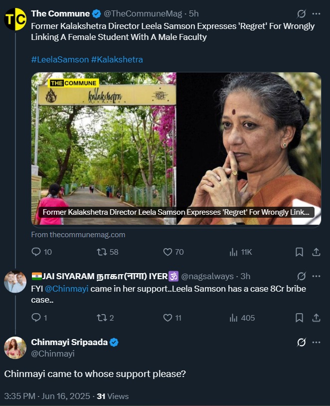 Now when the article on Leela Samson’s “regret” was published by The Commune on X, a netizen challenged her, stating, “FYI @Chinmayi came in her support… Leela Samson has a case…”, Chinmayi retorted, “Chinmayi came to whose support please?”, disregarding the fact that her own words supported Samson’s false allegations — without verifying their authenticity.
