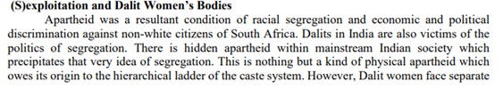 In the study, the authors compared caste-based discrimination in India with racial segregation frameworks, stating that forms of social exclusion faced by Dalits could be viewed through lenses similar to apartheid-style segregation. They further contended that Dalit women face compounded marginalization due to both caste and gender identities.