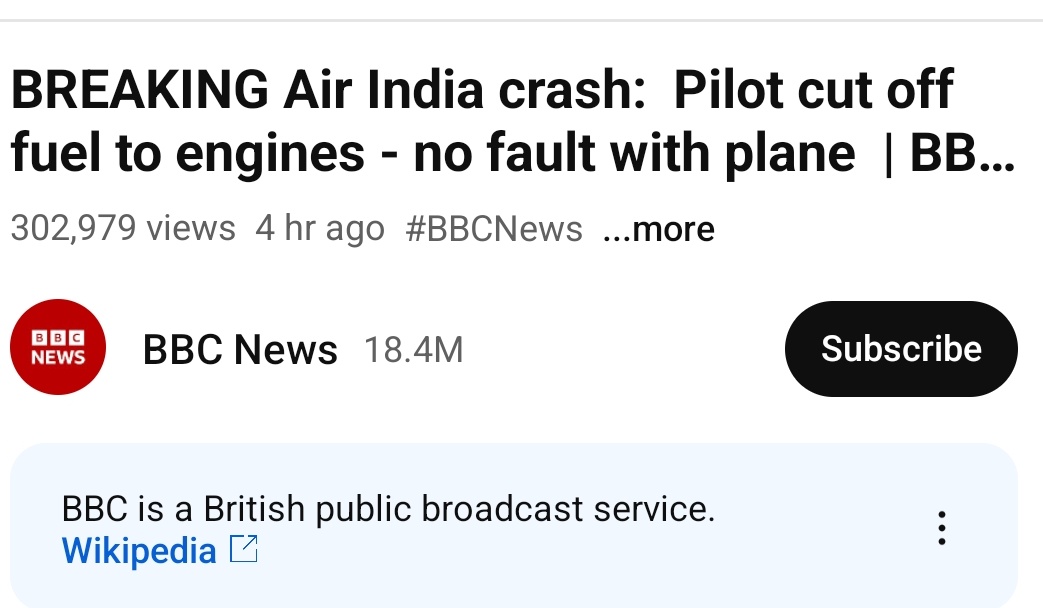 For instance, on 12 June 2025, the BBC, through its YouTube channel, published content with the caption, “Air India crash: Pilot cut off fuel to engines – no fault with plane.”