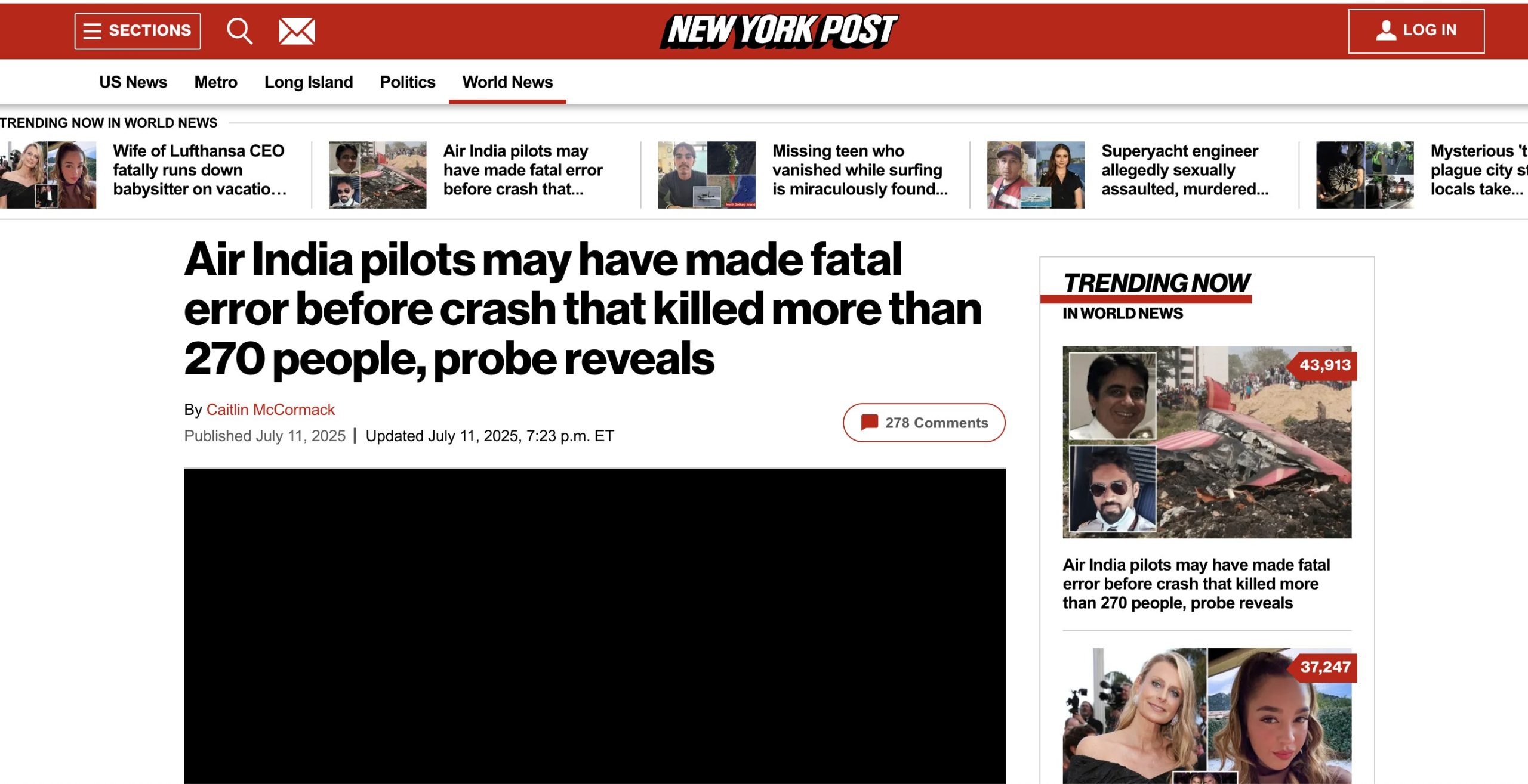 The New York Post ran the story under, “Air India pilots may have made fatal error before crash that killed more than 270 people, probe reveals.”