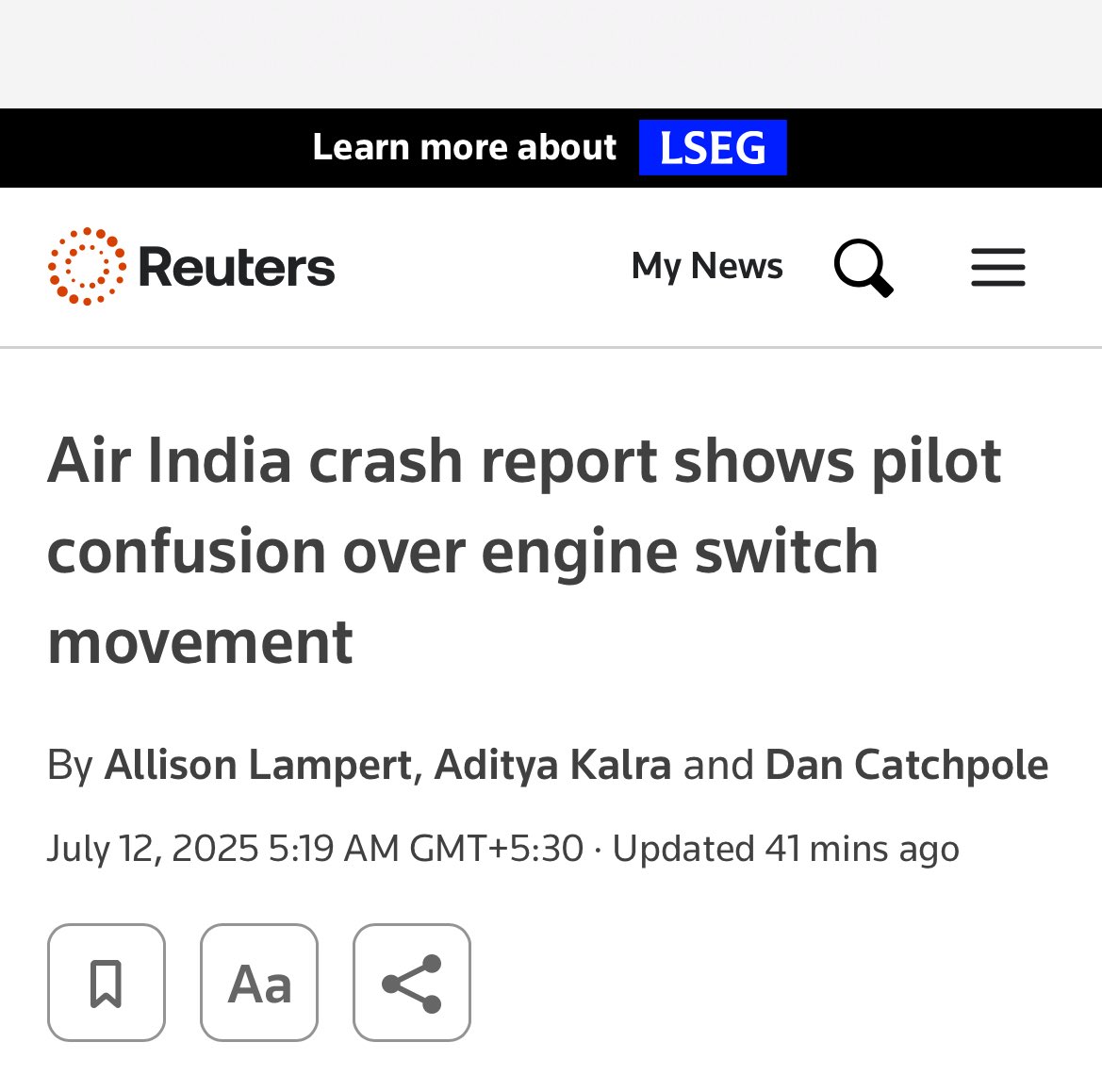 Reuters followed suit with a headline reading, “Air India crash report shows pilot confusion over engine switch movement.”