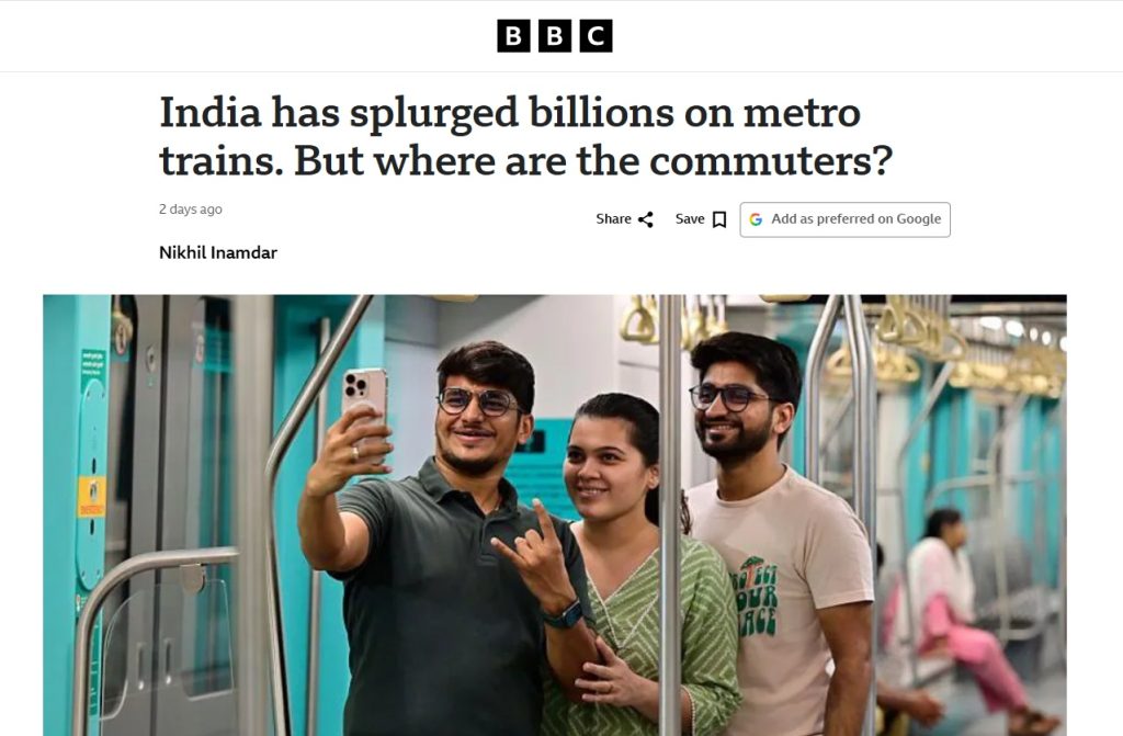 BBC’s article gets one thing right: some Indian metro systems have fallen short of the ridership promised in their DPRs, as per an IIT Delhi report. But it turns that valid caution into a sweeping narrative of “splurge” and underuse, ignoring both the scale of actual demand already visible and the fact that metro systems are long-gestation urban assets whose benefits extend beyond a narrow snapshot of current ticket counts.