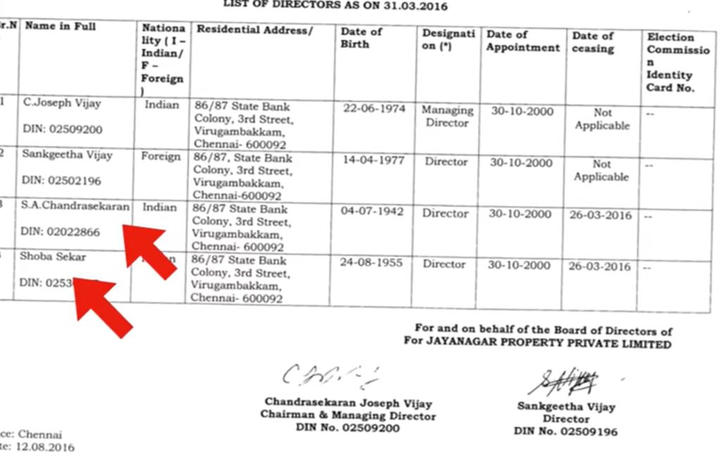 Following a public rift over Chandrasekhar’s attempt to float a political party in Vijay’s name, the actor is said to have cut ties with his parents in business matters. Subsequently, they no longer appear as partners in the later filings for Jaya Nagar Properties. Vijay first used Sangeetha as a front to edge out his parents from the company and is now seen using Rajendran in a similar fashion vis-à-vis Sangeetha.