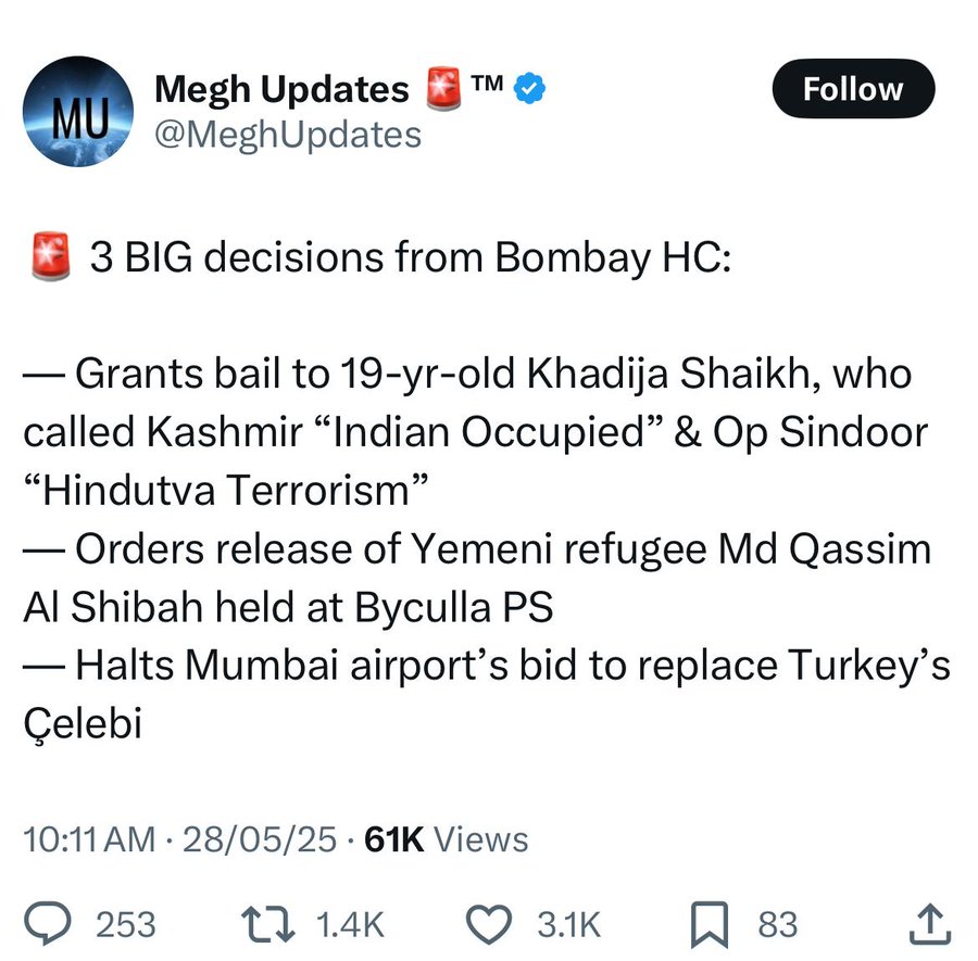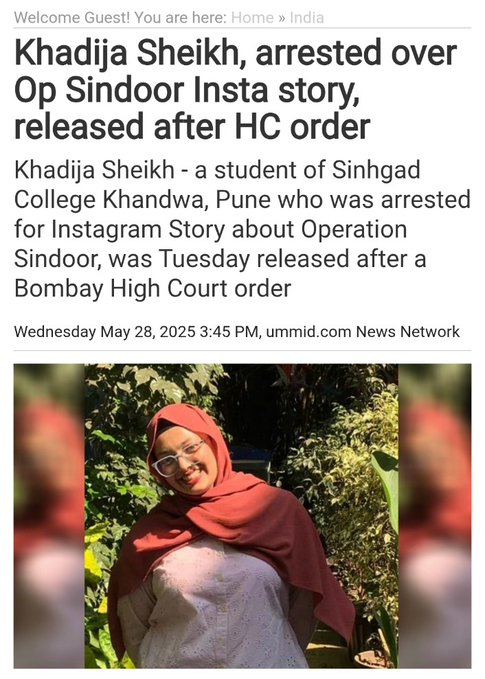 On 27 May 2025, the Bombay High Court slammed Maharashtra Police and Sinhgad Academy for arresting and rusticating 19-year-old student Khadija Sheikh over an Instagram post with pro-Pakistan sentiments during Operation Sindoor.