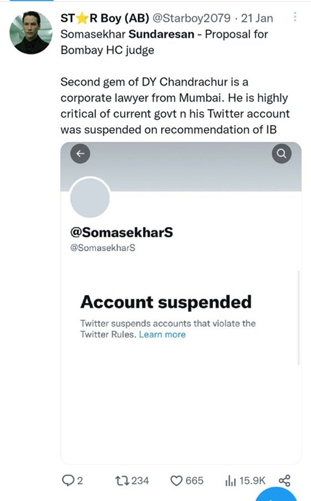 On the recommendation of the Intelligence Bureau (IB), Twitter suspended his account. Due to these factors, the Modi government initially declined to appoint him as a judge. The standoff between the Supreme Court Collegium and the Modi government lasted for two years, but ultimately, the government relented under the collegium’s pressure and appointed him.