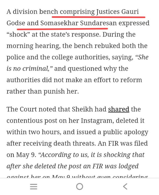 Justices Gauri Godse and Somasekhar Sundaresan called the actions “shocking” and said, “She is no criminal.”