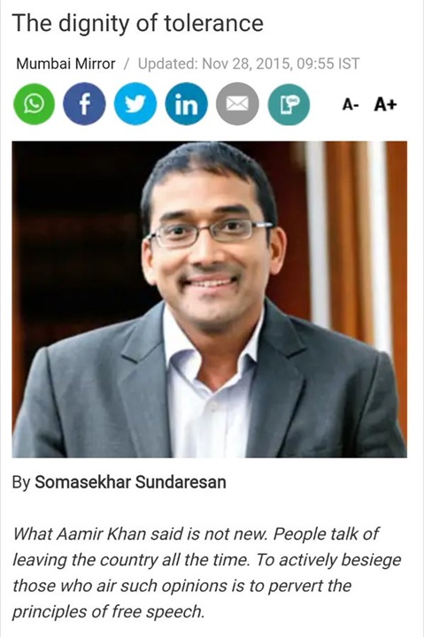 In response to Aamir Khan’s 2015 statement about rising intolerance in India, Somasekhar Sundaresan publicly supported the actor’s views and even authored an article defending Khan’s right to express concern, aligning himself with the broader discourse on dissent and free speech.