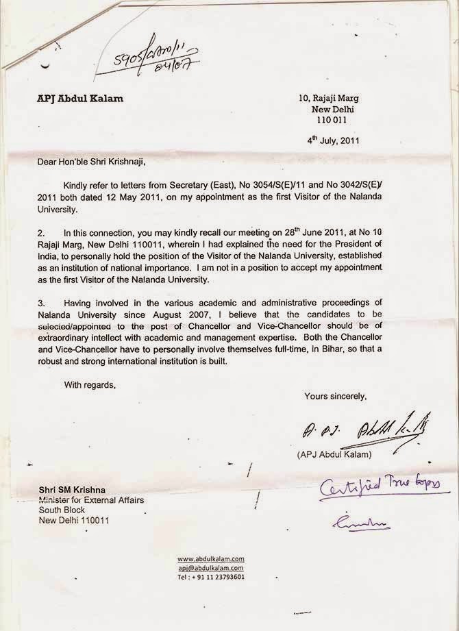 He does not say how Dr. Kalam resigned from Nalanda in disgust in 2011