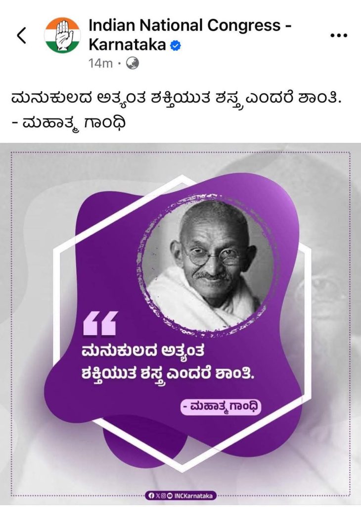 The Karnataka unit of the Indian National Congress drew flak on Wednesday 7 May 2025 after posting — and then deleting — a quote by Mahatma Gandhi promoting peace on social media, shortly after the Indian Air Force carried out airstrikes under ‘Operation Sindoor’ in response to the April 22 terrorist attack in Pahalgam, Jammu and Kashmir.