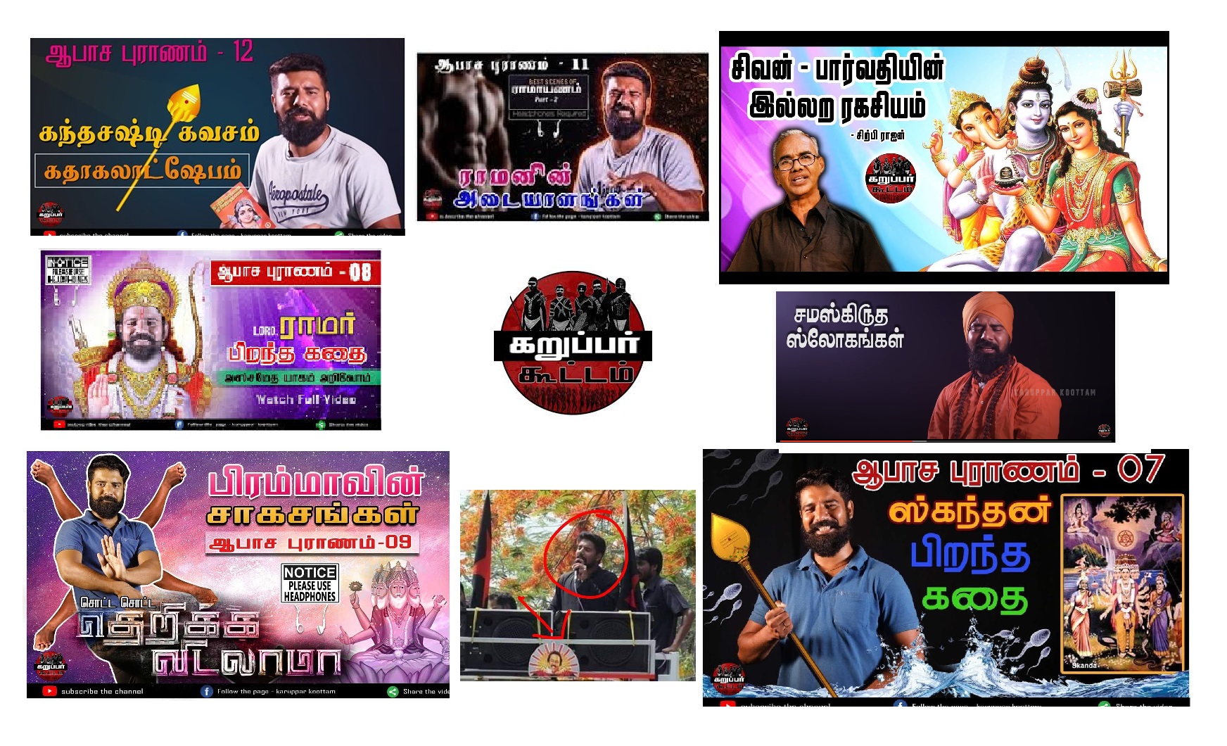 Karuppar Koottam channel has been posting videos abusing Hindu Gods, Hindus and Brahmins for a long time under the garb of ‘rationalism’. In the series titled “Aabasa Puranam” (Porn Puranam), members of the Karuppar Kootam (especially Surendhar Natarajan) use vulgar language and and trash-talk Hindu Gods like Murugan, Saraswathi, Brahma, etc. They claim that this is how it is written in Puranams and hence the name “Aabasa Puranam”.