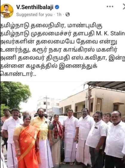 His post read, “In recognition that the leadership of the Honorable Tamil Nadu Chief Minister, Thalapathi M.K. Stalin, is essential for Tamil Nadu to stand tall, the Karur City Congress Women’s Wing President, Mrs. S. Kavitha, joined the party today.”